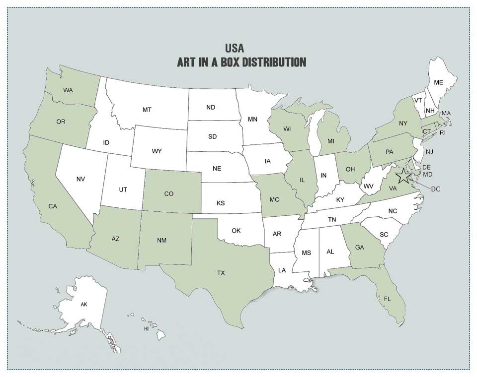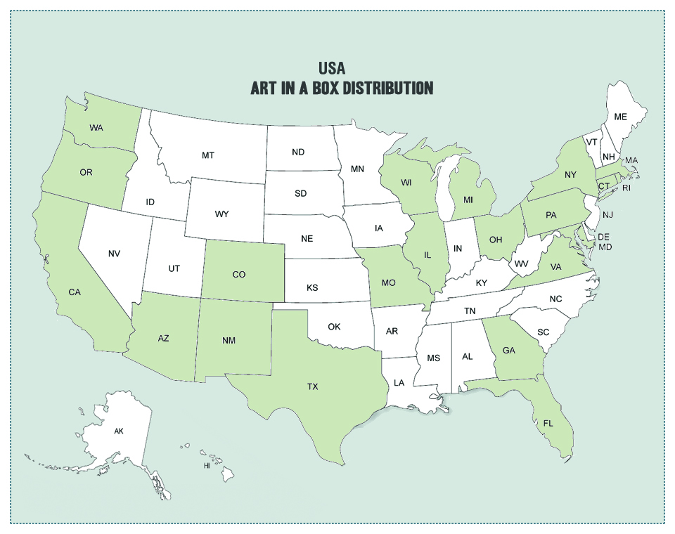 Join us on the campaign to send Bay Area art to every state in the good ol’ USA. We are constantly updating our map…Green shaded states currently have subscribers to Art in a Box. Check back on our progress. Is your state representing? Come on, let’s do this! Did we mention that every NEW subscriber in a state that is not colored green will get a special surprise in his/her box? Help spread art throughout the USA! Subscribe Today!